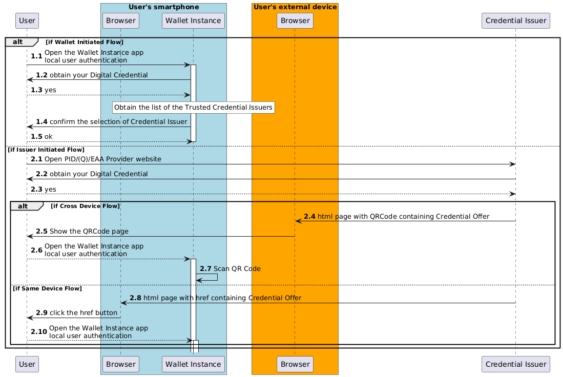 Passi 1.1-1.4 (Flusso Avviato dal Wallet): L'Utente, utilizzando l'Istanza del Wallet, seleziona il Credential Issuer tra quelli elencati nella lista delle entità affidabili.