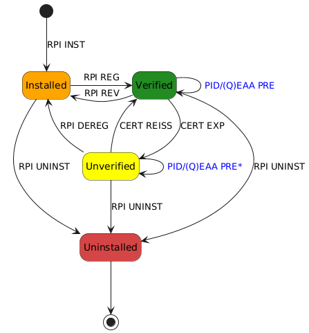 Across the Installed, Verified and Unverified states, the Relying Party Instance can be removed entirely through the Relying Party Instance uninstall (RPI UNINST) transition, leading to the Uninstalled state. If a Relying Party Instance is Uninstalled, it ends its lifecycle.