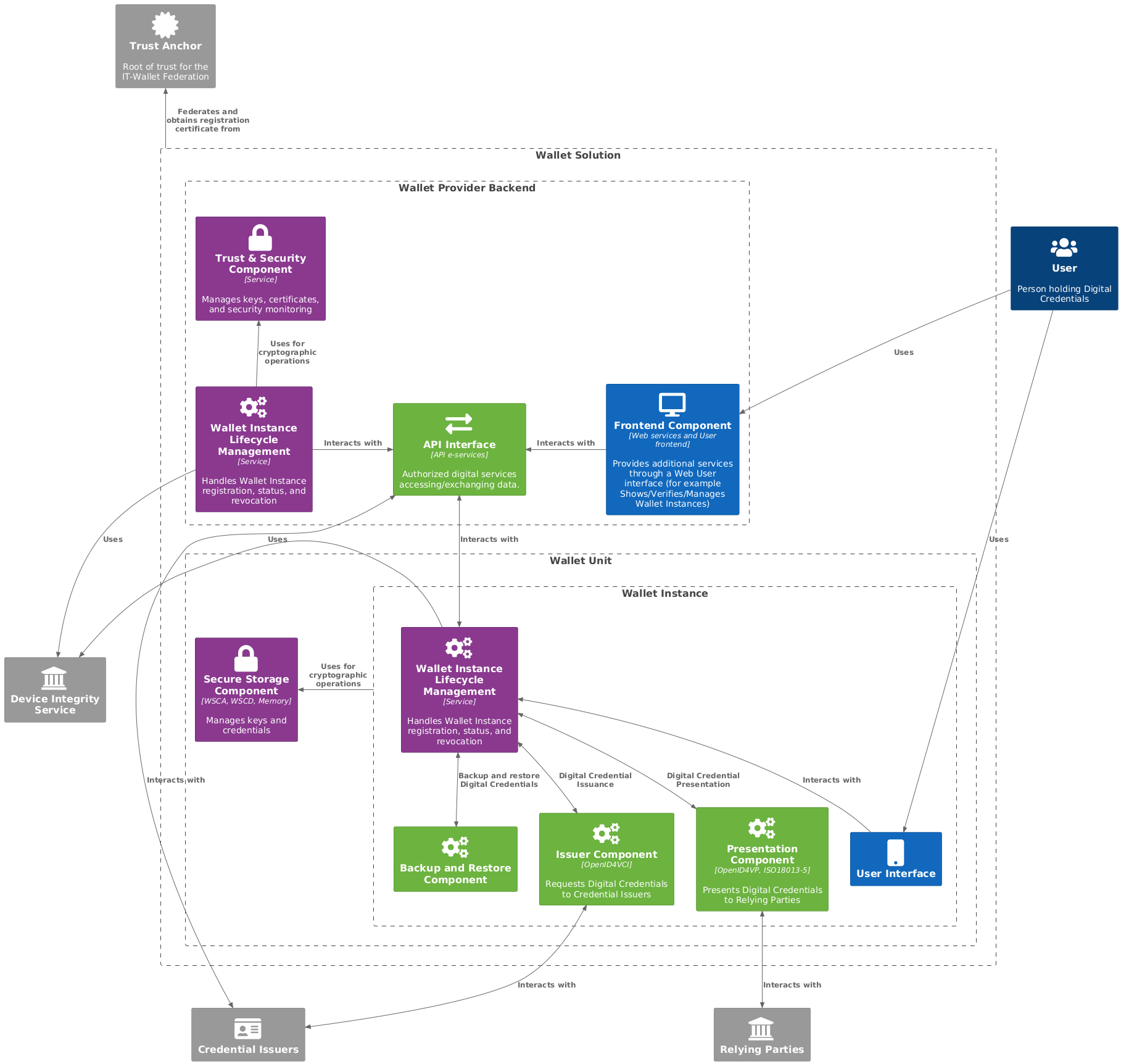 The Wallet Solution is issued by the Wallet Provider in the form of a mobile app and services, such as web interfaces. The mobile app serves as the primary interface for Users, allowing them to hold their Digital Credentials and interact with other participants of the ecosystem, such as Credential Issuers and Relying Parties. These Digital Credentials are a set of data that can uniquely identify a natural or legal person, along with other Qualified and non-qualified Electronic Attestations of Attributes, also known as QEAAs and EAAs respectively, or (Q)EAAs for short. Once a User installs the mobile app on their device, such an installation is referred to as a Wallet Instance for the User. By supporting the mobile app, the Wallet Provider ensures the security and reliability of the entire Wallet Solution, as it is responsible for issuing the Wallet App Attestation (WAA) and Wallet Unit Attestation (WUA). WAA proves the authenticity and integrity of the Wallet Instance, while WUA provides evidence that the keys used for Credential key binding are securely stored in a trustworthy WSCD. Additionally, WUA confirms that the Wallet Unit has not been revoked.