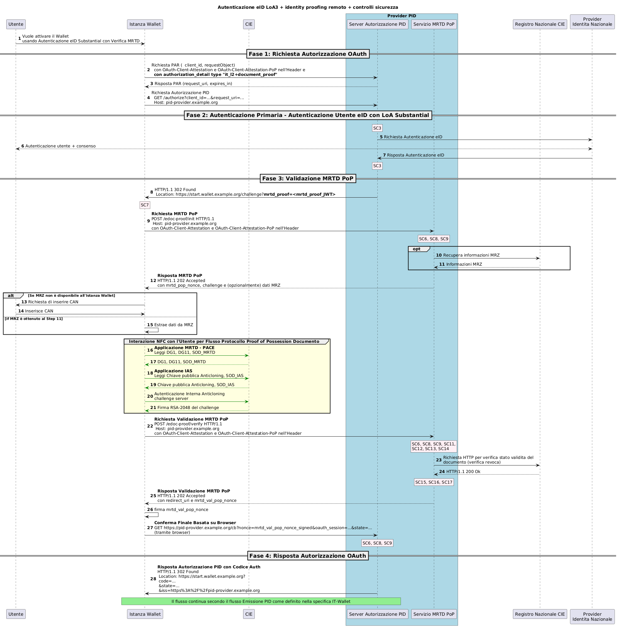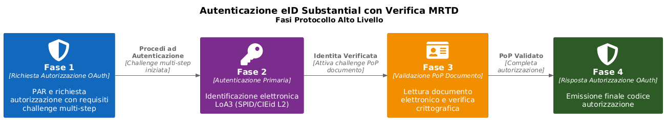 Questa Sezione definisce un protocollo di Autenticazione eID Substantial con Verifica MRTD che si integra nel flusso di emissione PID come definito nella Sezione Flussi Dettagliati per l'Emissione di Attestati Elettronici estendendo i flussi OAuth 2.0 per includere: