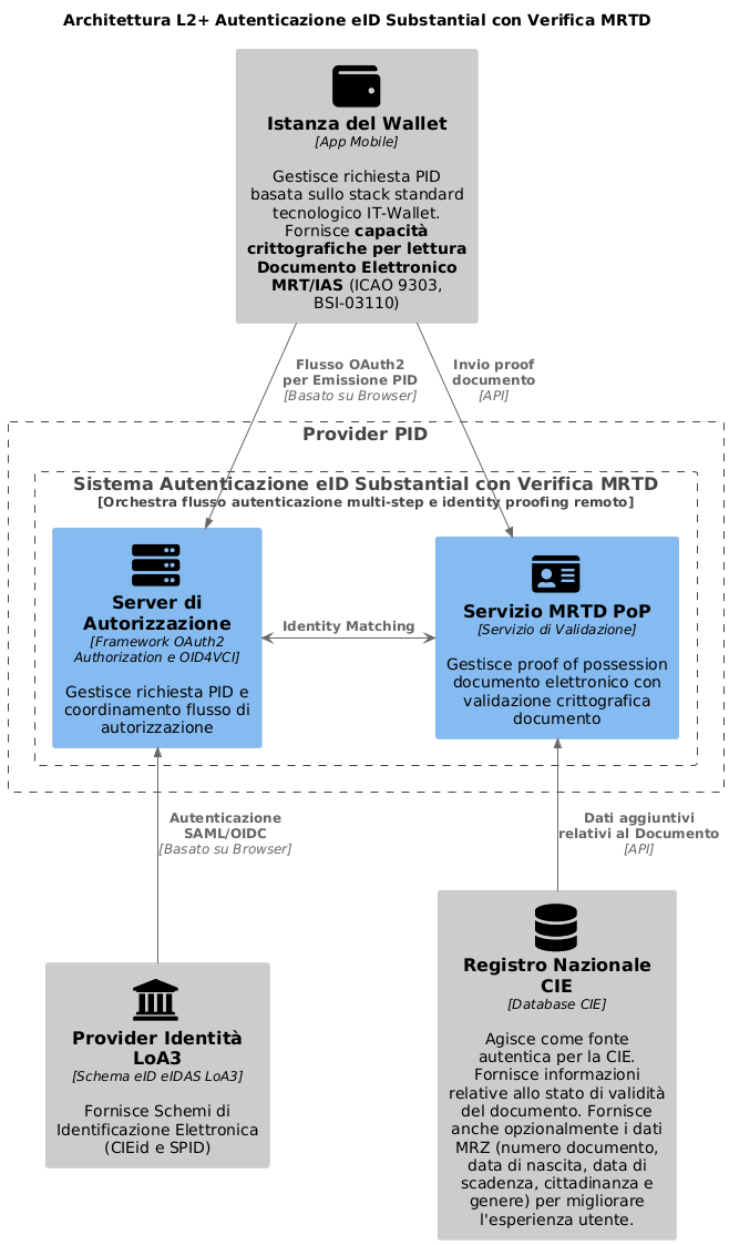 Mentre l'autenticazione CIEid con LoA High rimane il metodo primario per l'attivazione Wallet e l'emissione PID, il meccanismo di Autenticazione eID Substantial con Verifica MRTD definito in questa Sezione fornisce un approccio alternativo per migliorare l'accessibilità e l'usabilità del servizio, senza compromettere la sicurezza complessiva dell'ecosistema IT-Wallet.