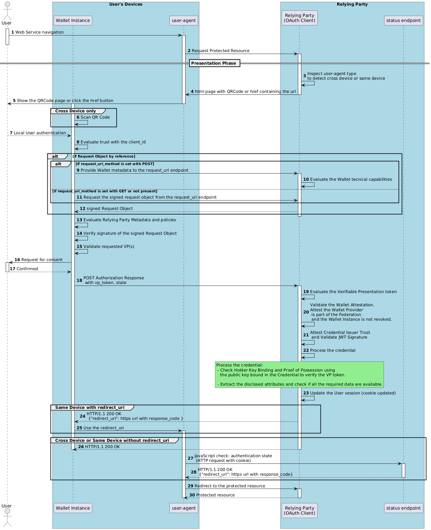 A seconda di come l'Utente stia interagendo con il frontend dell'App di Verifica Web, usando cioè il dispositivo in cui risiede l'Unità Wallet (Same Device) oppure un altro dispositivo (Cross Device), la Relying Party DEVE supportare i seguenti flussi remoti (RPR-84):