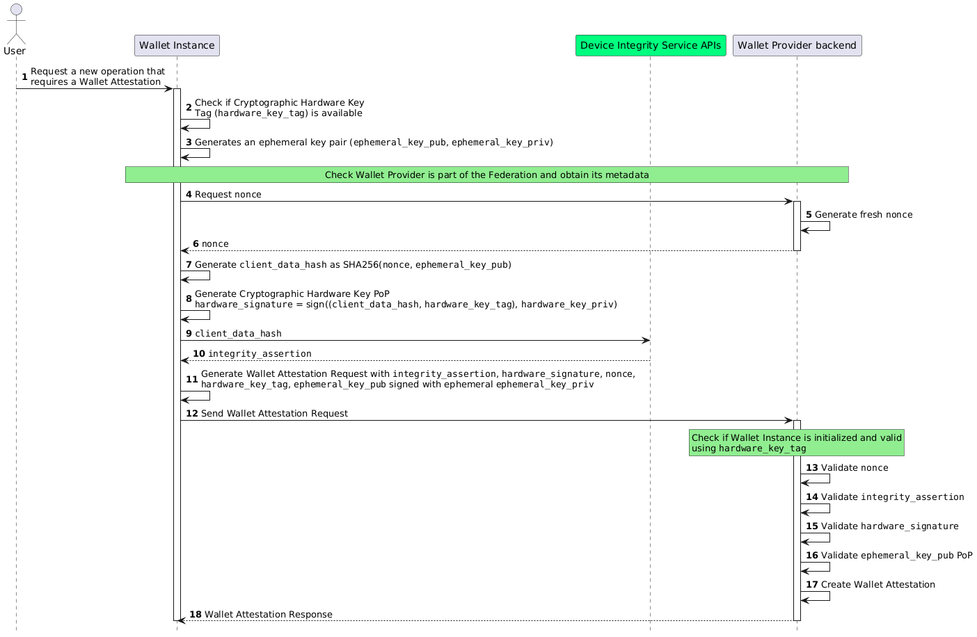 • riceve un valore integrity_assertion firmato per la Wallet App Attestation dal Servizio di Integrità del Dispositivo, autenticato dall'OEM (WP_140e).