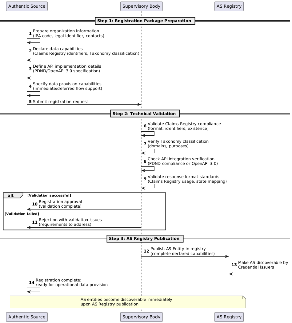 Authentic Sources MUST complete a structured registration process to confirm their status as authoritative data providers in the IT-Wallet ecosystem. This process includes specifying requirements and undergoing procedural validation, as detailed in Authentic Source Operator Journey.