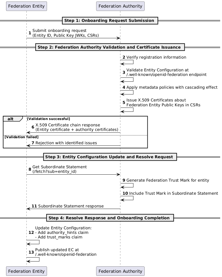 Federation Registry Integration: Upon successful onboarding completion, the entity's Federation Entity Identifier becomes discoverable through the Trust Anchor's entity listing mechanisms (as defined in The Infrastructure of Trust), indicating active federation participation. The entity becomes part of the federation infrastructure detailed in Registry Infrastructure.