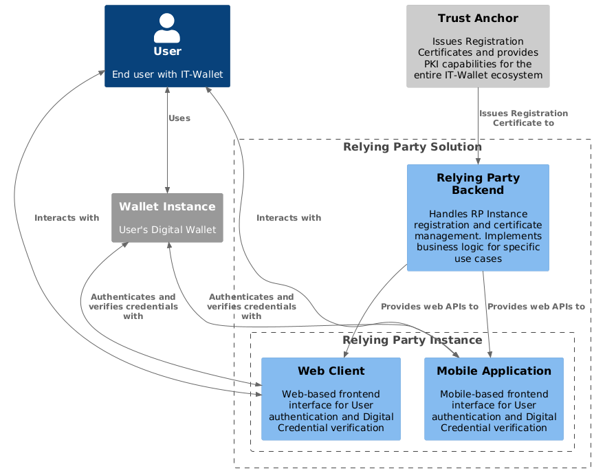 A Relying Party, as an Organizational entity relying upon IT-Wallet, provides Technical Solutions (Relying Party Solution) that could combine software, hardware, services, settings, and configurations, including Relying Party Instances for User authentication and Digital Credential verification.