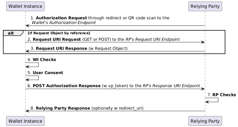 Authorization Request: the Wallet Instance obtains a URL in the Same Device flow or a QRCode in Cross Device flow containing directly the signed Request Object (passing a Request Object by value) or a pointer where the signed Request Object is available for download (passing a Request Object by reference). If by reference, Steps 2 and 3 are performed.