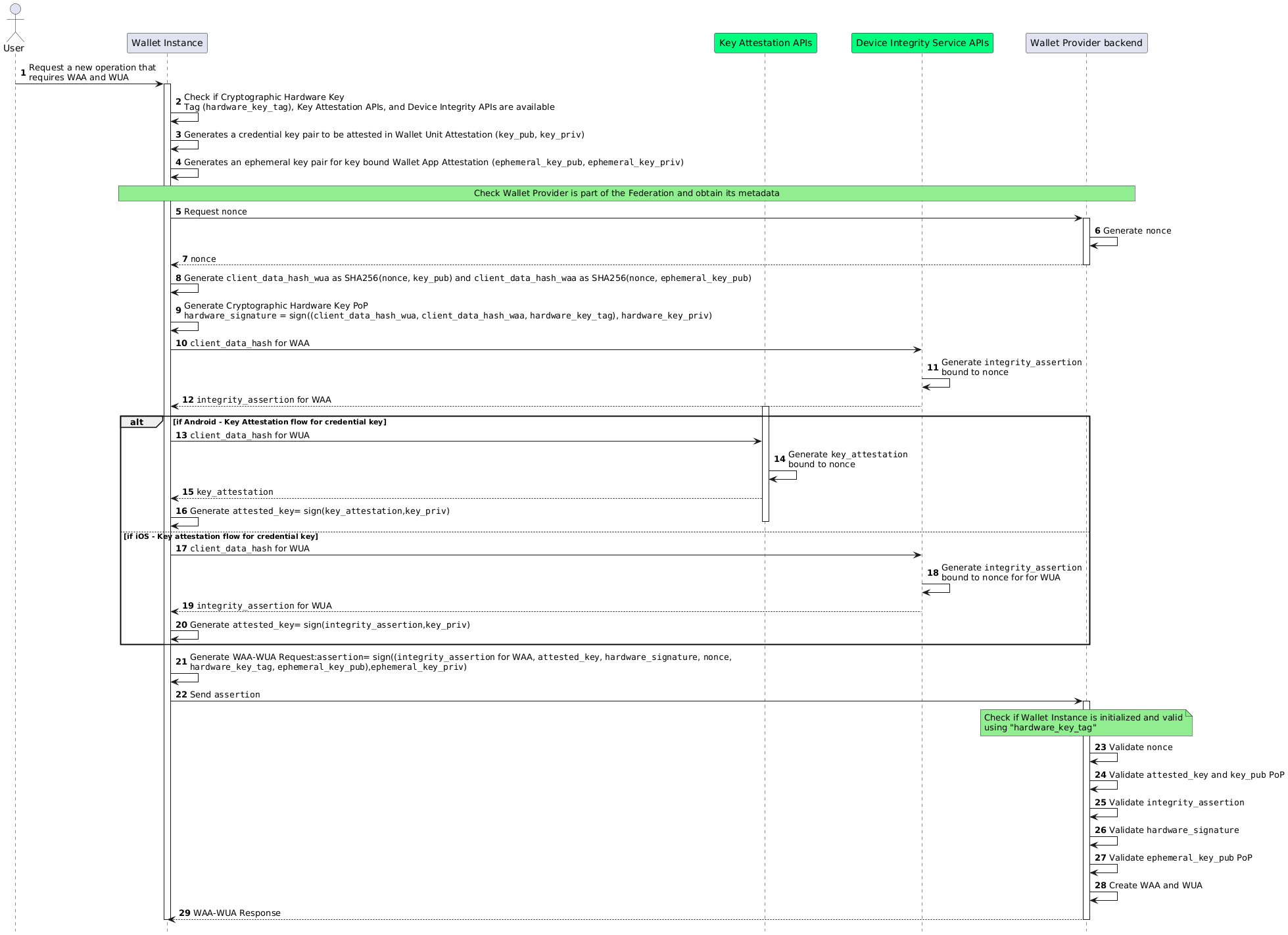hardware_signaturevalue by signing theclient_data_hash_waaandclient_data_hash_wuawith the Wallet Hardware's private key, serving as a proof of possession for the Cryptographic Hardware Keys (WP_140d).requests the Device Integrity Service to create an