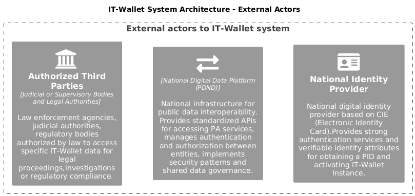 I sistemi esterni forniscono servizi che collegano l'ecosistema IT-Wallet all'infrastruttura digitale nazionale, consentendo l'interoperabilità con i servizi governativi esistenti e le fonti di dati.