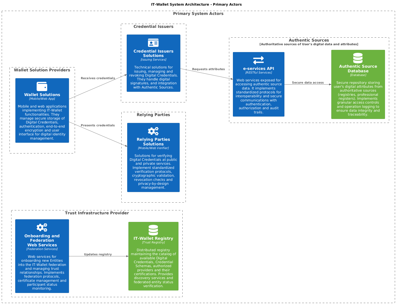 Il Sistema IT-Wallet è un ecosistema federato che consente la gestione sicura dell'Identità Digitale e lo scambio di Attestati Elettronici per cittadini e organizzazioni. L'ecosistema IT-Wallet è costruito su un'architettura multi-livello, dove gli organi di governance stabiliscono e mantengono l'infrastruttura di trust, gli Attori Primari implementano e gestiscono le Soluzioni Tecniche, e i sistemi esterni forniscono servizi aggiuntivi.