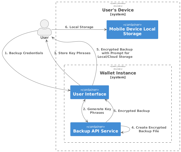 Passaggi 2-3: L'Istanza del Wallet, utilizzando le API di backup, seleziona casualmente 10 frasi chiave da un elenco di parole pre-generato e le mostra all'Utente (WP_120a). L'Utente DEVE conservare in modo sicuro la frase chiave scelta tra quelle proposte dal sistema (ad esempio, in un'app di gestione password) poiché sono fondamentali per il ripristino del backup (WP_120b).