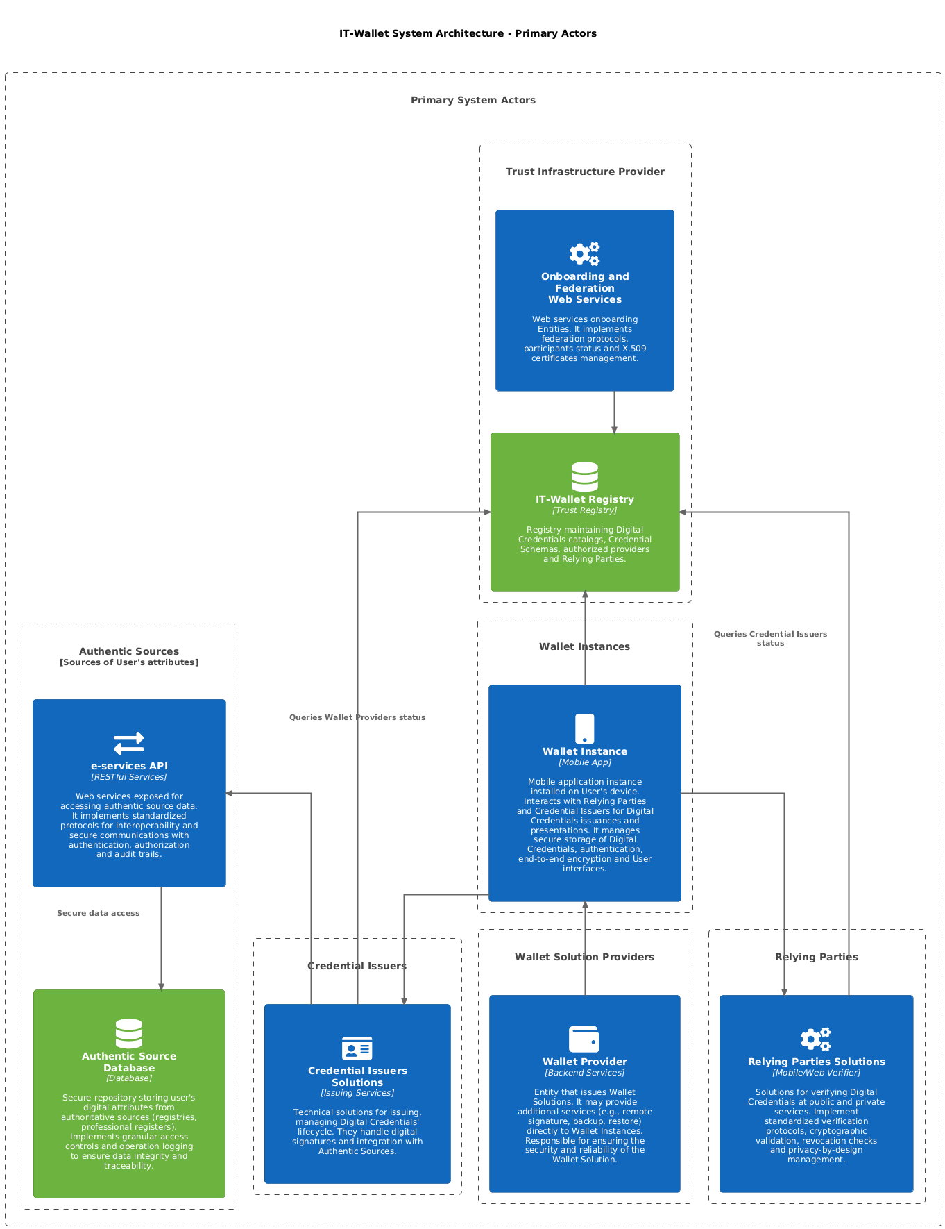 The IT-Wallet System is a federated ecosystem that enables secure Digital Identity management and Digital Credential exchange for citizens and organizations. The IT-Wallet ecosystem is built on a multi-layered architecture, where governance bodies establish and maintain the trust infrastructure, Primary Actors implement and operate the technical solutions, and external systems provide additional services.