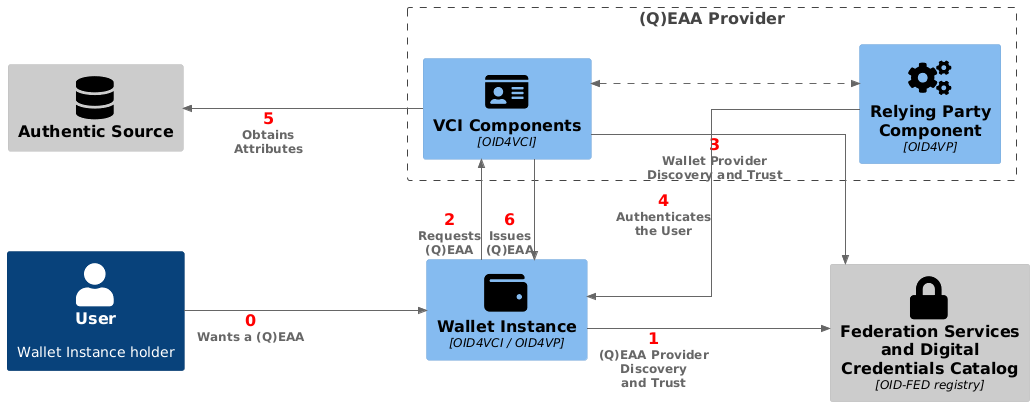 Similarly to the PID high-level flow, the above diagram depicts a (Q)EAA high-level flow starting from the User who wants to obtain a (Q)EAA (step 0). Below the description of the most relevant operations involved in the (Q)EAA issuance: