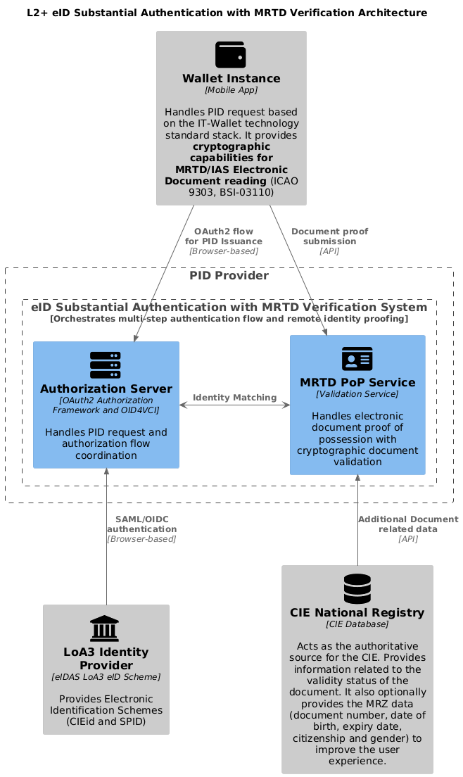 While CIEid with LoA High authentication remains the primary method for Wallet activation and PID issuance, the eID Substantial Authentication with MRTD Verification mechanism defined in this Section provides an alternative approach to enhance service accessibility and usability, without compromising the overall security of the IT-Wallet ecosystem.