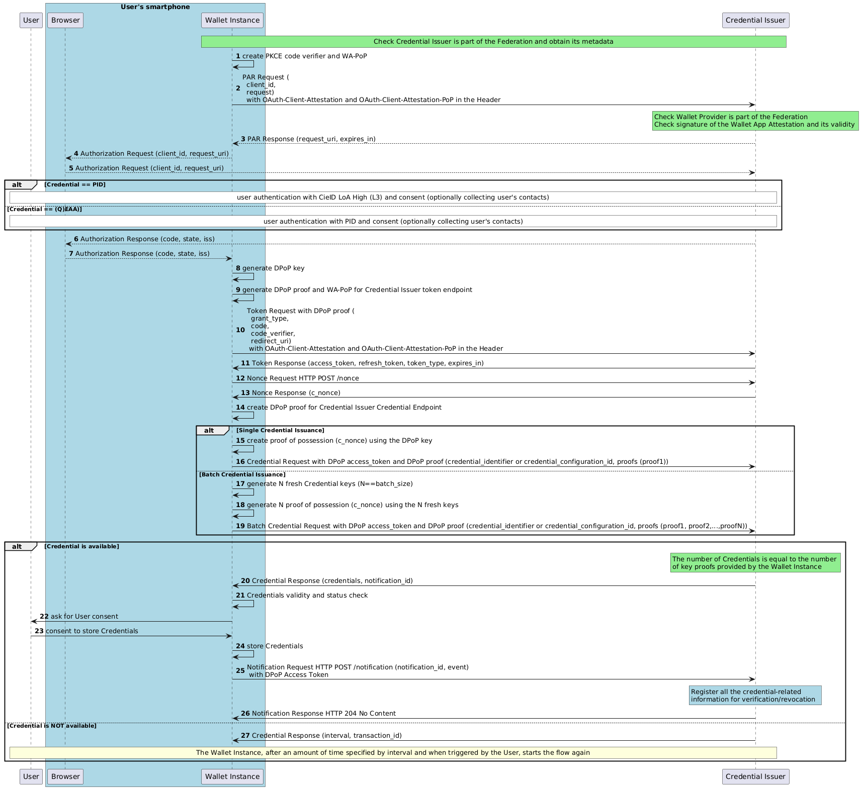 Una volta completato il flusso di richiesta dell'Utente, l'Istanza del Wallet elabora i Metadata del Credential Issuer come definito nella Sezione Meccanismo di Trust Evaluation. Inoltre, in caso di emissione di Credenziali in batch, l'Istanza del Wallet DEVE verificare che venga supportata l'emissione in batch tramite l'oggetto batch_credential_issuance presente nei metadati del Credential Issuer, da cui l'Istanza del Wallet può ottenere il valore batch_size.