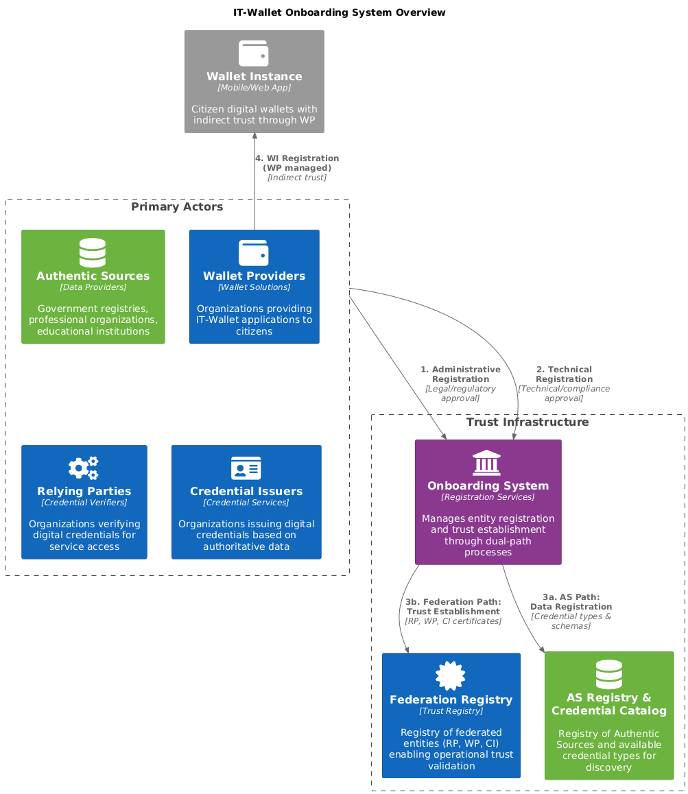 Registrazione Amministrativa: Tutte le entità (Fonti Autentiche, Relying Party, Fornitori di Wallet, Credential Issuer) DEVONO completare la registrazione amministrativa iniziale che convalida la loro posizione legale, conformità normativa ed eleggibilità organizzativa per partecipare all'ecosistema IT-Wallet.
