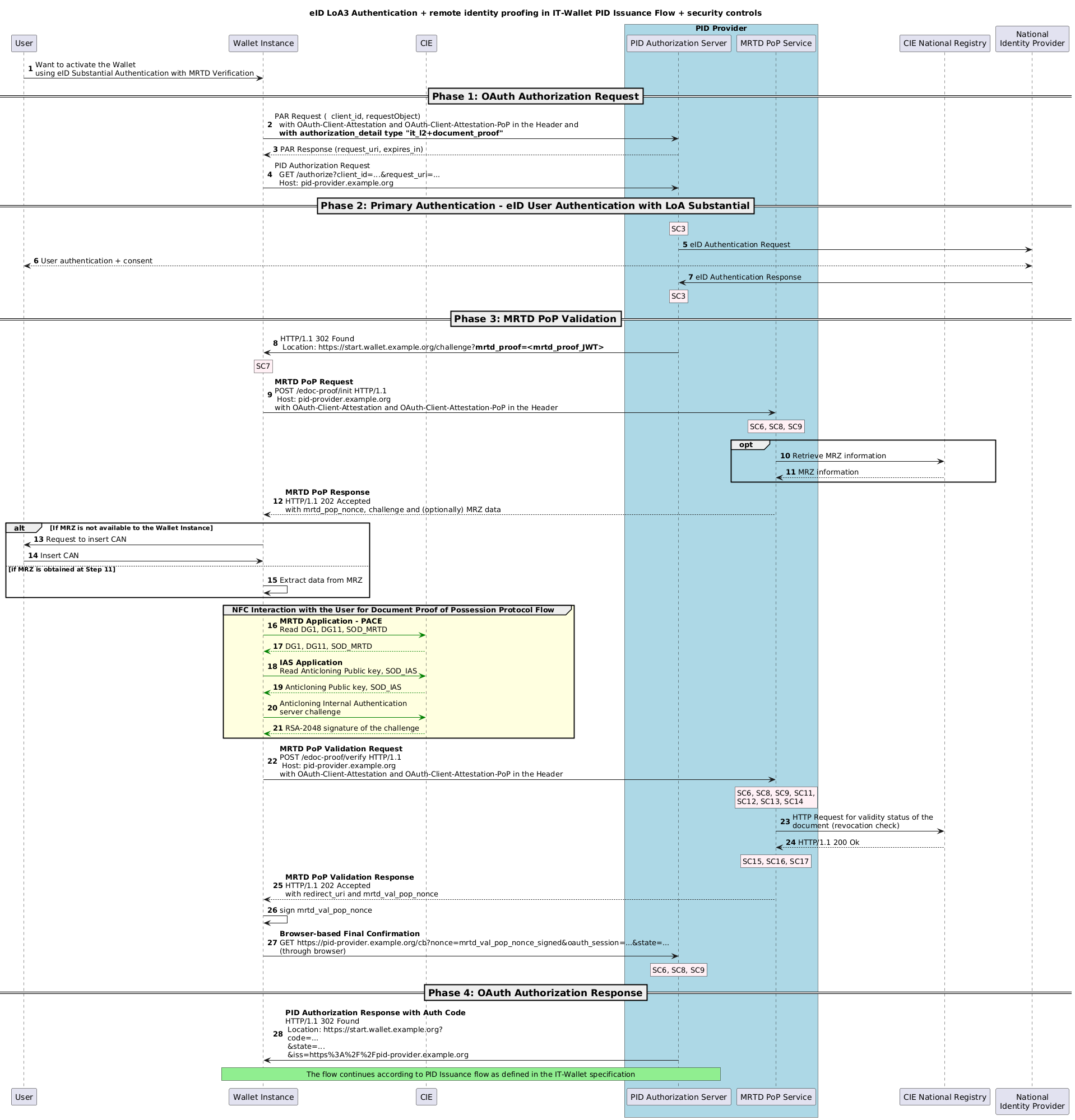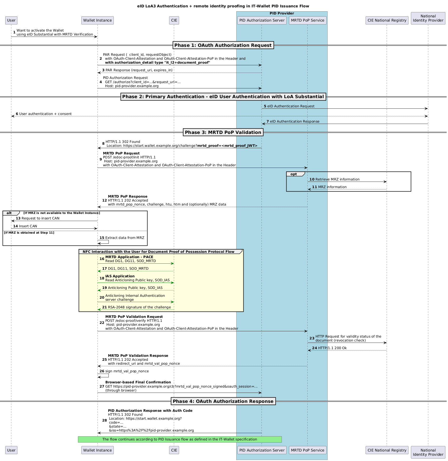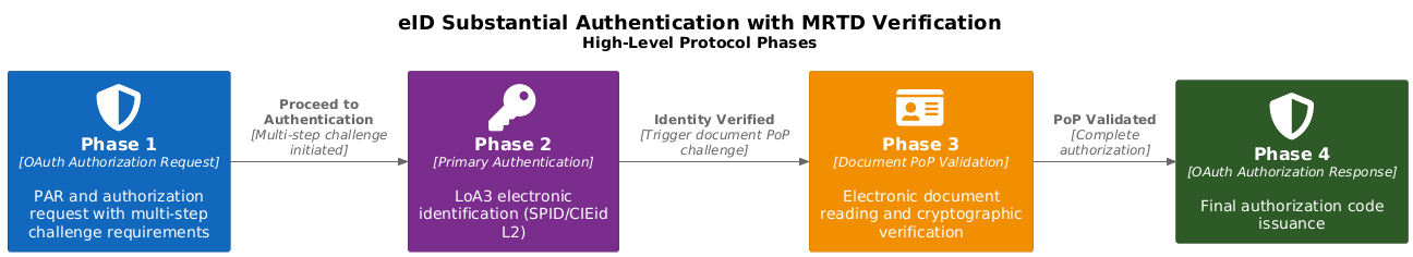 This Section defines an eID Substantial Authentication with MRTD Verification protocol that integrates within the PID issuance flow as defined in the Section Credential Issuance Low-Level Flows extending OAuth 2.0 flows to include: