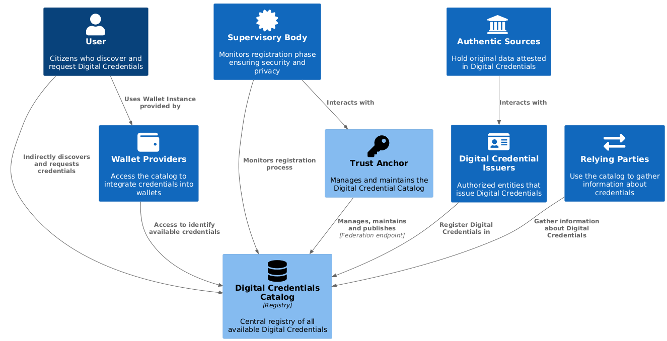 Digital Credentials Catalog: Public discovery mechanism for available Credential types with their metadata and issuance information.