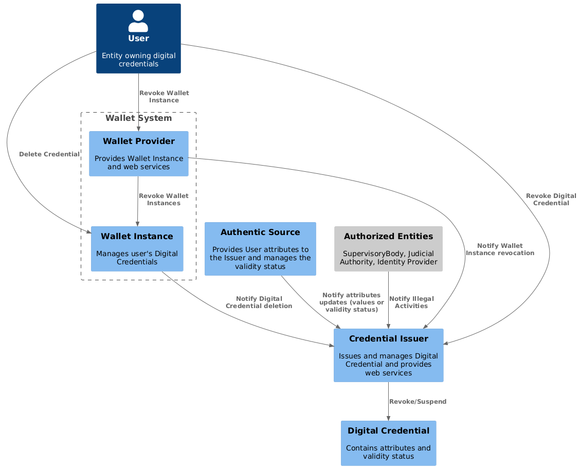 Le Fonti Autentiche gestiscono gli attributi separatamente dagli Attestati Elettronici, i quali verificano l’autenticità in modo analogo ai documenti fisici. La perdita di un documento fisico non implica la perdita dei diritti che rappresenta; significa solo che l’Utente non può dimostrarli. Tuttavia, se un Utente perde determinati diritti a causa di una grave infrazione, la Fonte Autentica revocherà gli attributi correlati. In tali casi, quando gli attributi di un Utente vengono aggiornati, le Fonti Autentiche DEVONO notificare ai Fornitori di Attestati Elettronici di aggiornare lo stato di validità di qualsiasi Attestato Elettronico che contenga tali attributi.
