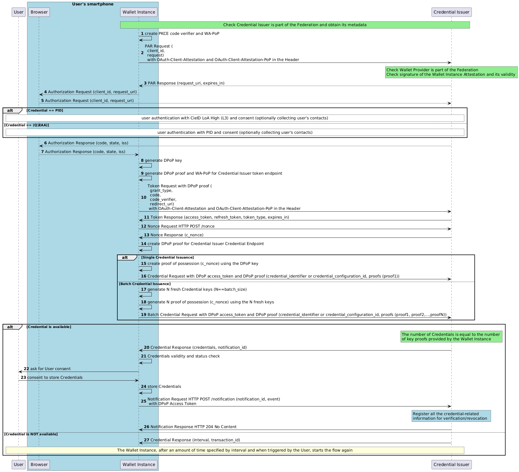 Once User Request flow is completed, the Wallet Instance processes the Metadata of the Credential Issuer as defined in Section Trust Evaluation Mechanism. Additionally, in the case of Batch Credential issuance, the Wallet Instance MUST check the support of batch issuance by looking for the batch_credential_issuance object in the Credential Issuer metadata, from where the Wallet Instance can get the batch_size value.