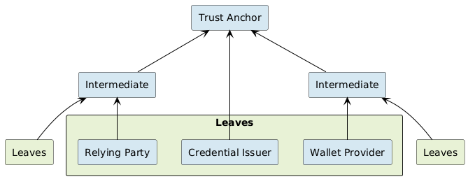 Fig. 6.1 I ruoli all'interno della Federazione, dove il National Trust Anchor supervisiona i suoi subordinati, che includono uno o più Intermediari e Foglie.¶
